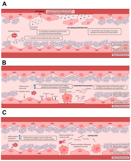 Mechanisms underlying the release of endothelial damage products into peripheral blood circulation. Release of (A) endothelial cells, (B) endothelial microparticles and (C) cell-free DNA into the peripheral blood stream.