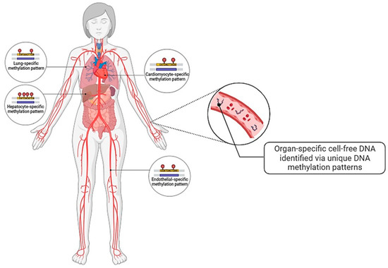 Moss et al. has demonstrated the possibility of establishing an atlas of tissue- or organ-specific methylation patterns by comprehensively describing a methodology to achieve it [144]. Although such a database has not been established yet, it is a promising area of research to achieve quick, yet accurate diagnoses. For example, with known organ-specific DNA methylation patterns, cfDNA can be conveniently extracted from blood plasma, processed (i.e., bisulphite conversion) and quantified for the organ-specific methylated sequences [145]. This allows us to assess the damage to specific organs due to the pathologic conditions.