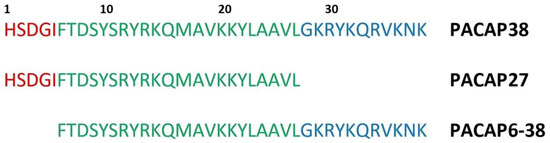 - Miyata, A.; Jiang, L.; Dahl, R.D.; Kitada, C.; Kubo, K.; Fujino, M.; Minamino, N.; Arimura, A. Isolation of a Neuropeptide Corresponding to the N-Terminal 27 Residues of the Pituitary Adenylate Cyclase Activating Polypeptide with 38 Residues (PACAP38). Biochem. Biophys. Res. Commun. 1990, 170, 643–648. [Google Scholar] [CrossRef]