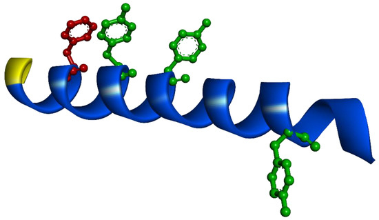 The 3D structure of PACAP27, which is identical to the first 27 residues of PACAP38. This figure is based on the PDB file 6M1I (from Cryo-EM structures of PACAP38-PAC1R-Gs [83]). The yellow coloring represents the N-terminal of the peptide, while the aromatic residues crucial for fluorescence are highlighted (green: tyrosine; red: phenylalanine). This figure was created using Discovery Studio Visualizer (v16.1.0.15350, Biovia).