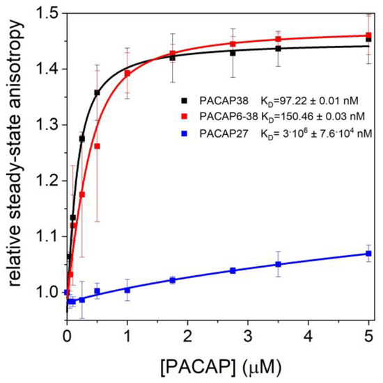 For quantitative analysis, the PACAP concentration dependence of the steady-state anisotropy (r) was fitted using the following equation: