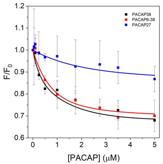 Normalized fluorescence intensity (F/F0) of 0.2 µM A488NHS-labeled actin as a function of increasing PACAP concentrations. Fluorescence measurements were conducted with PACAP concentrations ranging from 0 µM (control) to 5 µM. The data points represent the mean ± standard deviation from three independent experiments.