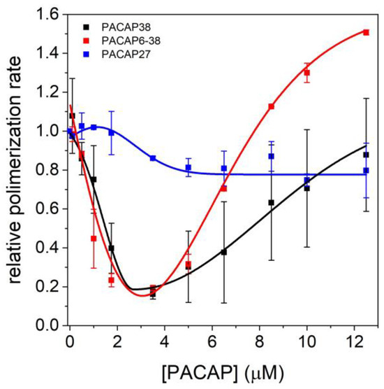 The actin polymerization assay was conducted to further investigate the effects of PACAP forms on actin (Figure 6). Pyrene-labeled actin (2.5 μM, 5% labeled) was used to monitor the actin polymerization kinetics in the presence of varying concentrations of PACAP forms (0–12.5 μM). Our results indicate that PACAP27 does not significantly affect actin polymerization, whereas PACAP38 and PACAP6-38 substantially alter the kinetics of actin incorporation. At low concentration ranges (nM to a few µM), they inhibit actin monomer incorporation, with the elongation rate decreasing by up to 20% at approximately 3 µM PACAP. At the highest applied concentration (12.50 µM), the relative polymerization rate for PACAP38 returned to its initial value. Notably, PACAP6-38 showed an approximately 50% increase in polymerization rate, indicating a biphasic nature.