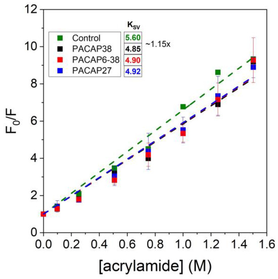 The fluorescence quenching experiments confirmed that the binding of PACAP induces structural change in actin. Figure 7 depicts the quenching of tryptophan fluorescence of actin by acrylamide in the presence or absence of various PACAP forms/fragments. The calculated Stern–Volmer Constants (KSV) do not suggest a greater change in the structure of actin, but the binding of PACAP induced a conformational change with no doubt. Interestingly, all three types of PACAP fragments exerted the same effect, proving that the extent of conformational change was independent of the PACAP isoform. Our experiments revealed that the binding of PACAP to actin filaments moderately decreased the accessibility of tryptophan residues. Unlike previous studies, PACAP27 showed similar quenching effects to PACAP38 and PACAP6-38, suggesting that the absence of one tyrosine did not significantly impact quenching.
