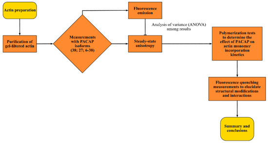 This figure outlines the sequential steps involved in the preparation, analysis, and characterization of PACAP interactions with actin. The key steps include PACAP and actin preparation, steady-state anisotropy and fluorescence emission measurements, polymerization assays, and fluorescence quenching studies.