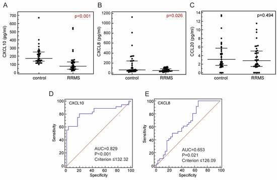 Concentrations of CXCL10 (A), CXCL8 (B) and CCL20 (C) in the sera of control subjects (N = 35) and patients with relapsing-remitting multiple sclerosis in relapse (RRMS; N = 36). Ability of concentrations of CXCL10 (D) and CXCL8 (E) in the sera to discriminate between RRMS patients in relapse and control subjects. Concentrations were determined using a cytometric bead-based array (LEGENDplex™). Markers represent individual values, horizontal lines and bars are median and IQR (A–C). Red lines represent reference lines, blue lines represent ROC curves (D,E). Statistical significance (p values), area under curve (AUC), sensitivity, specificity and “cut off” point (criterion) is marked on plots; Mann–Whitney test (A–C) or ROC curve analysis (D,E). Significant statistical difference is written in red.
