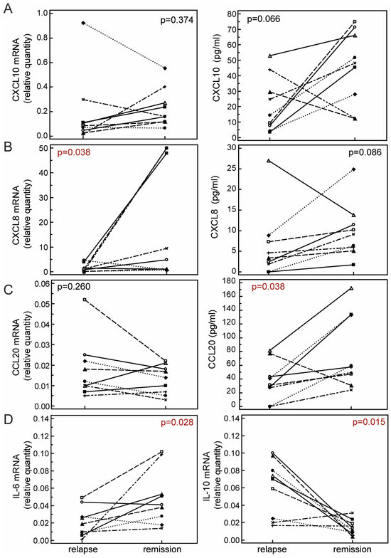Gene expression of CXCL8 and CXCL10 was, in the majority of assessed patients, higher in remission than in relapse (8/9 for CXCL8, and 7/9 for CXCL10). However, the difference was statistically significant only for the gene expression of CXCL8 (Figure 2A,B). Serum concentration of CCL20 showed a similar pattern as other chemokines, and was significantly lower in relapse than in remission, but its gene expression was similar in both phases (Figure 2C).