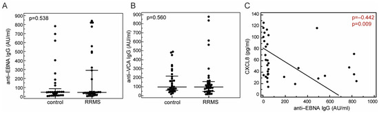 Concentrations of anti-EBNA IgG and anti-VCA IgG did not differ between RRMS patients (anti-EBNA IgG 43.60 [25.52–290.28] AU/mL; anti-VCA IgG, 97.02 [47.67–156.53] AU/mL) and controls (anti-EBNA IgG, 46.53 [11.48–86.17] AU/mL; anti-VCA IgG, 95.68 [58.90–218.01] AU/mL, p = 0.538; p = 0.560, respectively, Mann–Whitney test, Figure 3A,B). Furthermore, concentrations of anti-EBV antibodies were not associated with disease characteristics. In addition, we separately assessed the associations of anti-EBV antibodies with chemokine concentrations within the RRMS group and the healthy control group of the cross-sectional cohort. In the RRMS group, serum concentration of anti-EBNA IgG was inversely associated with the serum concentration of CXCL8 (ρ = −0.442, p = 0.009, Figure 3C), while this association was absent in the group of healthy control individuals (ρ = 0.202, p = 0.267), which might suggest the specific effects of EBV infection on immune cell trafficking and CXCL8 secretion in RRMS. Concentration of anti-EBNA IgG was not associated with concentrations of CXCL10 (ρ = −0.134, p = 0.451) and CCL20 (ρ = 0.004, p = 0.982) in the RRMS group, nor in healthy control subjects (CXCL10, ρ = −0.047, p = 0.788; CCL20, ρ = 0.162, p = 0.353). Concentration of anti-VCA IgG was not associated with any of the selected chemokines in RRMS patients (CXCL8, ρ = −0.169, p = 0.330; CXCL10, ρ = 0.152, p = 0.385; CCL20, ρ = −0.004, p = 0.981).