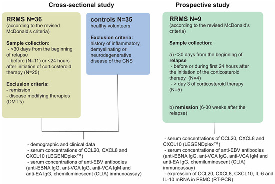 Schematics of the study design. The cross-sectional part of the study included 36 patients with RRMS admitted to Clinical Hospital ‘Sveti Duh’, within 30 days from last relapse. The diagnosis of RRMS was established according to the revised McDonald’s criteria [67]. Patients in remission and those who were taking disease-modifying therapies (DMT’s) before or at the time of sample collection were excluded from the study. Samples were collected either before (N = 11) or within 24 h after initiation of corticosteroid therapy (N = 25). Healthy volunteers (N = 35), matched by age and gender to MS patients, without history of inflammatory, demyelinating or neurodegenerative disease of CNS were also included in the study. The prospective part of the study included an additional 9 patients whose blood samples were collected during relapse and after they achieved remission (6–30 weeks after the relapse). In both cross-sectional and prospective groups’ samples, sera were used to determine the concentrations of chemokines and anti-EBV antibodies. In the prospective group gene expression of chemokines was additionally assessed in peripheral blood mononuclear cells (PBMC). Four samples from the prospective group in relapse were collected before or during the first 24 h after the initiation of the corticosteroid therapy, while five samples were collected on or after the third day of 5-day pulse corticosteroid therapy. Expression levels of assessed chemokines and cytokines were not significantly different between these two groups of patients in relapse.
