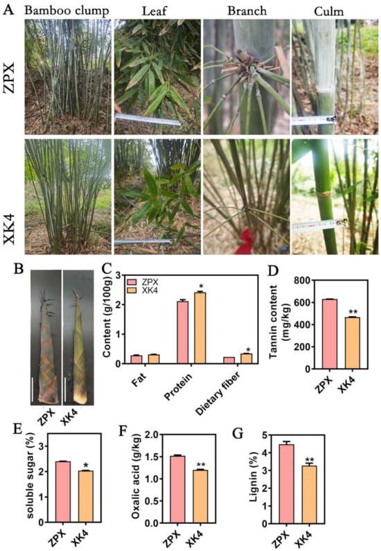 Nutrient composition analysis of ZPX and XK4 D. farinosus bamboo shoots. (A) Representative photographs of tissues of ZPX and XK4 bamboo species, including bamboo clump, leaf, branch, and culm. (B) Phenotypes of ZPX and XK4 bamboo shoots. The scale bar indicates 10 cm. (C) Determination of fat, protein, and dietary fiber content in two bamboo shoots. (D) Determination of tannin in two bamboo shoots. (E) Determination of soluble sugar content in two bamboo shoots. (F) Determination of oxalic acid content in two bamboo shoots. (G) Determination of lignin content in ZPX and XK4 bamboo shoots. Error bars indicate the standard deviation obtained from three biological replicates. Asterisks indicate significant differences obtained using t-tests, * p < 0.05, ** p < 0.01.