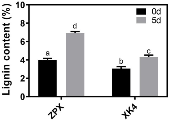 Changes in lignin content of two genotypes of bamboo shoots after 5 days of cold storage at 4 °C. Different lowercase letters indicate significant differences obtained using one-way ANOVA analysis. Error bars represent the standard variance obtained from three biological replicates.