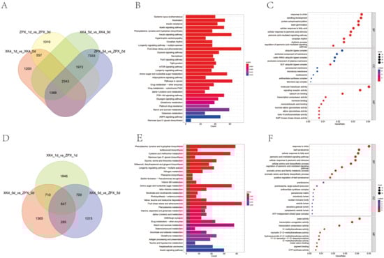 Analysis of differentially expressed genes in ZPX and XK4 of D. farinosus bamboo shoots after 1 and 5 days of cold storage. (A) Venn diagram analysis of DEGs in ZPX and XK4 D. farinosus bamboo shoots after 1 and 5 days of cold storage, respectively. (B) KEGG enrichment results of shared DEGs in ZPX and XK4 D. farinosus bamboo shoots after 1 and 5 days of cold storage. (C) GO enrichment results for shared DEGs in ZPX and XK4 D. farinosus bamboo shoots after 1 and 5 days of cold storage. (D) Venn diagram analysis of DEGs between ZPX and XK4 D. farinosus bamboo shoots after 1 and 5 days of cold storage. (E) KEGG enrichment results of DEGs between ZPX and XK4 D. farinosus bamboo shoots after 0, 1, and 5 days of cold storage. (F) GO enrichment results between ZPX and XK4 D. farinosus bamboo shoots after 1 and 5 days of cold storage. Detailed data on transcriptome analyses are in Supplementary Table S6.