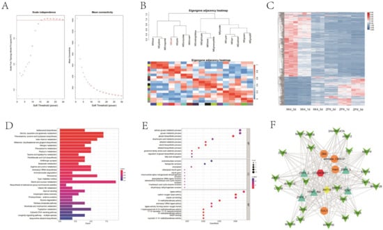 WGCNA analysis of the DEGs in ZPX and XK4 bamboo shoots after cold storage. (A,B) Weighted gene co-expression network analysis (WGCNA) of ZPX and XK4 D. farinosus bamboo shoots after cold storage for different days, soft threshold calculation results (A), and WGCNA analysis module clustering results (B). (C) Heatmap of gene expression clustering contained in the red module. (D) KEGG enrichment results for genes contained in the red module. (E) GO enrichment results for genes contained in the red module. (F) OMT, pheylalanine, flavonoid, and their co-expressed transcription factor-related networks in the red module; yellow represents flavonoid synthesis pathway genes; orange represents phenylpropane metabolism pathway genes; and green represents transcription factors. Detailed data on transcriptome analyses are in Supplementary Table S6.