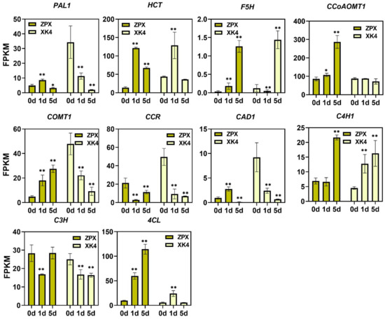 Transcription level of key enzyme genes for lignin synthesis. Error bars represent the standard variance obtained from three biological replicates. Asterisks indicate significant differences using the one-way analysis of variance (* p < 0.05, ** p < 0.01).