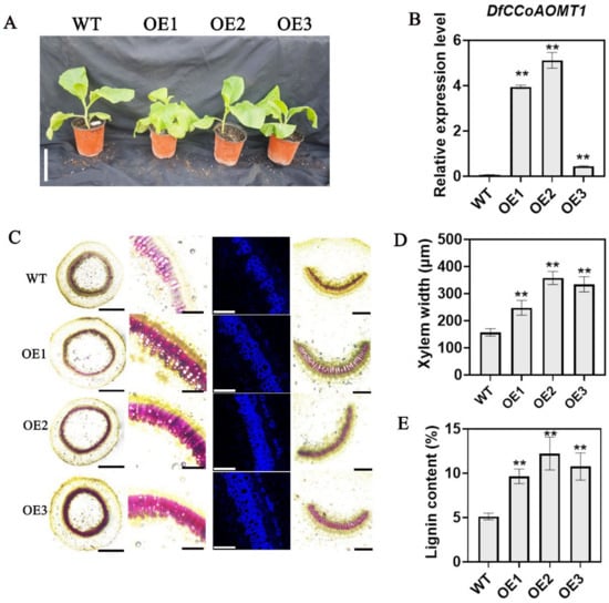 To detect the expression of DfCCoAOMT1 in the transgenic plants, quantitative real-time PCR (RT-qPCR) was conducted. The Nicotiana tabacum NtActin gene was used as the internal reference gene for normalization [31].