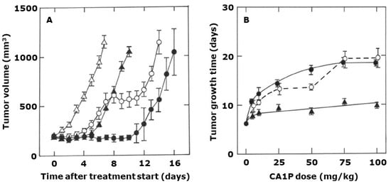 The schedule dependent effect of CA1P on tumor growth. (A) Tumor volume measured in untreated controls (△), or after the start of treatment with 50 mg/kg CA1P administered once only (▲), weekly (⭘), or three times in one week (⬤). (B) Tumor growth time when mice were treated with different CA1P doses administered either once (▲), weekly (⭘), or three times in one week (⬤). All results are means (±1 SEM) for an average of nine mice/group.