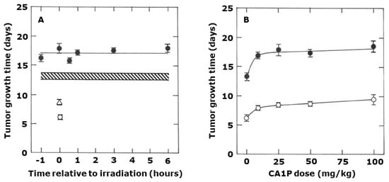 The effect of CA1P and radiation on tumor growth delay. (A) Tumor growth time in untreated controls (⭘), or after treatment with 50 mg/kg CA1P (△), 10 Gy radiation (shaded area), or radiation + CA1P (⬤). (B) Tumor growth time following treatment with different CA1P doses alone (⭘) or when CA1P injected 1 h after irradiating with 10 Gy radiation (⬤). Results are means (±1 SEM) for an average of nine mice/group.