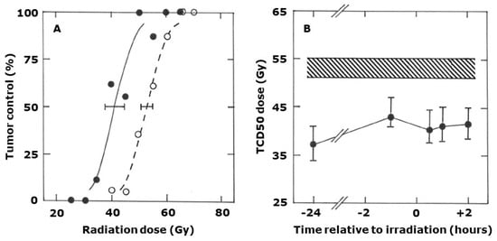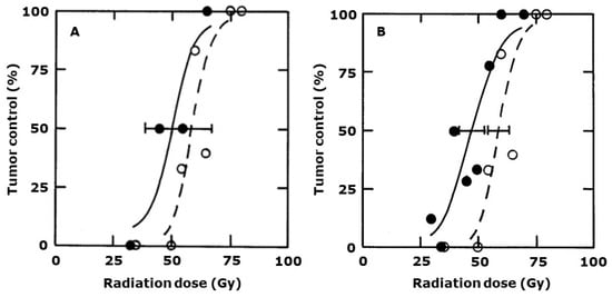 The response of tumors to treatment was assessed using both a regrowth delay assay and local tumor control, as described previously []. For the regrowth delay assay, tumor volume was measured as described above on a daily basis following treatment. The tumor growth time (TGT5; time taken to reach five times the treatment volume) was then calculated from the regrowth curves. With the local tumor control assay, tumor-bearing animals were observed on a weekly basis up to 90 days post-treatment and the number of animals in each treatment group showing tumor control within this 90-day period was recorded. However, for the fractionated radiation treatments where repeated treatments with the same radiation dose were applied, dose–response curves were only possible using a clamped top-up dose; this approach ensured that the tumor microenvironment conditions were the same for all treatment groups. Basically, three days after the final stereotactic or conventional fractionation irradiation, mice had their tumor-bearing legs clamped with tubing and then treated with a range of radiation doses. The clamp was applied for 5 min before irradiating and maintained for the period of irradiation [,].