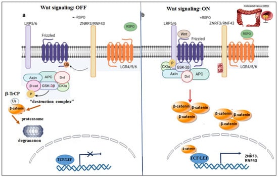Wnt signaling On–Off. A schematic model portraying Wnt signaling On–Off states. (a) OFF status. When Wnt ligands are absent, the “destruction complex” actively acts to tag β-catenin (e.g., phosphorylation) for degradation via the proteasomal compartment. FZDs are ubiquitinated, internalized, and degraded in the endosome. (b) ON status. In the presence of Wnt ligands, the “destruction complex is dismantled and recruited to the cell membrane, and β-catenin is accumulated. In the presence of RSPO, no ubiquitination of FZDs takes place.