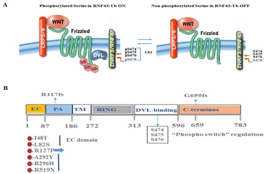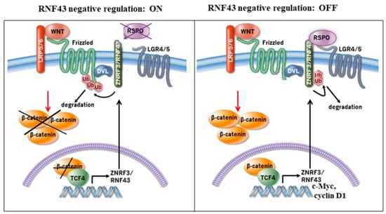 Ring finger protein 43 (RNF43) and ring finger protein 3 (ZNRF3) or RNF43/ZNRF3, act as a negative regulator of the Wnt signaling pathway and are associated with FZD receptors, leading to receptor ubiquitination, internalization, and lysosomal degradation. For this, RNF43/ZNRF3 surprisingly co-associates with FZDs via recruitment of the Wnt-signaling component DVL []. RNF43/ZNRF3 are closely related proteins that belong to the RING family of E3 ubiquitin ligases, which transfer ubiquitin from the E2 enzyme to a substrate. The specificity of RNF43/ZNRF3 among the family is their substrate FZDs, the Wnt signaling receptors, tagged by ubiquitin for degradation. Both proteins comprise an amino-terminal extracellular region of 39% sequence conseservation between the two proteins, a transmembrane region, and a cytoplasmic tail, including the RING-type E3 ubiquitin ligase.