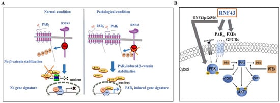 PAR2-induced β-catenin stabilization was observed in the presence of Wnt/FZD inhibitors [], namely, either LGK 974, a Wnt porcupine inhibitor, or secreted frizzled-related protein (sFRP5), an FZD inhibitor. Therefore, we considered the consequences of the PAR2-induced negative regulation of β-catenin stabilization, independent of Wnts. We demonstrated that biotin-labeled cell surface PAR2 was strongly ubiquitinated and degraded in the presence of RNF43, as shown by assessing the levels of cell surface biotin-labeled PAR2 detected using Western blots and FACS analyses []. Consequently, powerful inhibition of β-catenin stabilization and TOPflash transcriptional activity were obtained. In this manner, a new target for RNF43-mediated degradation, namely, PAR2/f2rl1 GPCRs, was described (as shown in Figure 1). Importantly, PAR2 is a potent oncogene that plays a central role in diverse epithelial malignancies, including colon [,], breast [,,], and ovarian cancers [,]. The E3 ubiquitin ligase RNF43 acts on PAR2, similar to its homolog ZNRF3, which negatively regulates the turnover of the Wnt receptors, the FZD and LRP6. Notably, PAR2 acts with LRP6 as a co-receptor to stabilize β-catenin []. Whether the association between RNF43 and PAR2 is mediated via DVL as an adaptor for the FZD [] remains to be determined. As with FZDs, the turnover of PAR2 is rescued by the R-spondin–LGR5 axis. The modulation of RNF43 gene levels showed that by silencing rnf43 in aggressive cancer cells, sustained surface expression of endogenous PAR2 was observed [].