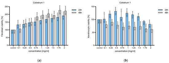 The effect of colostrum 1 on the cell viability of: (a) 1BR.3.N human skin fibroblasts; (b) human neonatal epidermal keratinocytes (n = 6); *** p < 0.001; ** p < 0.01, * p < 0.05.