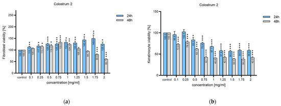 Human epidermal keratinocytes exhibited varying sensitivity to colostrum 1 (Figure 2b). Incubation for 24 h at low concentrations (up to 0.5 mg/mL) slightly increased cell viability by 32.1%, whereas high concentrations (2 mg/mL) reduced viability by up to 82.1%. After 48 h, the effect of decreasing keratinocyte viability was already evident at the lowest dose of 0.1 mg/mL, and increasing the concentration resulted in additional suppression of keratinocyte cell viability, i.e., a reduction of around 40% at 2 mg/mL.