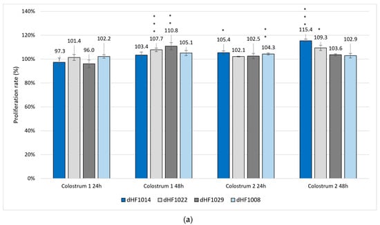 Generally, the dHF cells tended to achieve higher proliferation rates than the control culture after a 48-h culture; however, dHF cells treated with colostrum 2 showed higher proliferation after 24 h (Figure 4b).