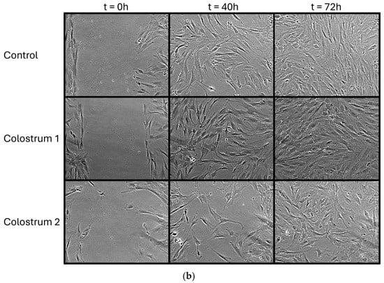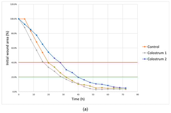 dHF cells cultured with colostrum 1 showed an increased wound closure rate. Cells treated with colostrum 1 proliferated and migrated faster than the cells in the control culture, covering 40% of the initial scar area after 16 h of culture and 20% of the initial scar area after 28 h. Meanwhile, cells treated with colostrum 2 covered 40% of the initial scar area in 28 h and 20% after 40 h of culture (Figure 5).