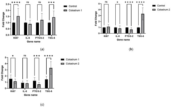 Expression of Ki67, IL-6, PTGS-2, and TSG-6 in dHF after 48 h treatment with either colostrum 1 or colostrum 2 (n = 4). Panels: (a) dHF cells treated with colostrum 1 vs. control; (b) dHF cells treated with colostrum 2 vs. control; (c) colostrum 1 vs. colostrum 2. Statistical significance was determined in GraphPad program with the Mann–Whitney U-test with Holm–Šídák correction for multiple comparisons; **** p < 0.0001; *** p < 0.001; * p < 0.05; ns means no significance.