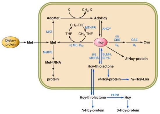 Schematic representation of homocysteine metabolism in humans and mice: the remethylation (i), transsulfuration (ii), and homocysteine (Hcy)-thiolactone (iii) pathways. Protein-metabolism-related reactions involving Hcy are highlighted by blue arrows. The rectangle symbolizes the cell, the outside area is plasma, and the oval labelled “Dietary protein” represents the digestive tract. See text for description. AdoMet, adenosylmethionine; BPHL, biphenyl hydrolase-like; CBS, cystathionine β-synthase; MAT, Met S-adenosyltransferase; Met, methionine; MetRS, methionyl-tRNA synthetase; MS, Met synthase; MTHFR, methylenetetrahydrofolate reductase; and THF, tetrahydrofolate. Reproduced with permission from Jakubowski [].
