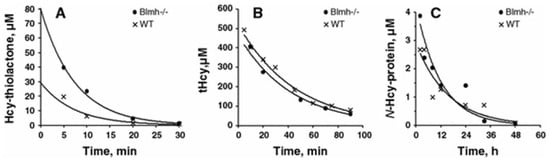 In mice, Hcy-thiolactone is quickly cleared from the body (t1/2 = 5.1 min) [,], about six times faster than Hcy (t1/2 = 31.8 min) [,] and 120-times faster than N-Hcy-protein (t1/2 = 10.2 h) [] (Figure 2). Efficient Hcy-thiolactone clearance is responsible for its relatively low levels, compared with Hcy and N-Hcy-protein levels in humans and mice [].
