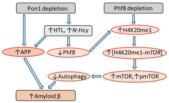 Interestingly, Pon1 depletion induced changes in the Phf8 → H4K20me1 → mTOR → autophagy pathway in a Pon1−/−5xFAD mouse brain and in Pon1-silenced neuroblastoma cells that mimicked the changes induced by HHcy in a Pon1+/−5xFAD mouse brain and in Hcy-thiolactone- or N-Hcy-protein-treated mouse neuroblastoma N2a-APPswe cells []. Pon1 depletion or HHcy similarly increased the accumulation of Aβ in the brain. An earlier work showed that biochemical outcomes of Pon1 depletion and HHcy were identical: HHcy elevated Hcy-thiolactone and N-Hcy-protein [,], as did Pon1 depletion [,]. Pon1 depletion by RNA interference or treatments with Hcy-thiolactone or N-Hcy-protein similarly elevated Aβ in mouse neuroblastoma cells. Taken together, these findings suggest that increased accumulation of Aβ in a Pon1-depleted brain is mediated by the effects of Hcy metabolites on mTOR signaling and autophagy. These findings also suggest that Pon1 is a negative regulator of mTOR signaling by controlling Hcy-related metabolite levels that influence the extent of H4K20me1 binding at the mTOR promoter.