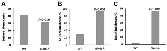 Latenecy (A) and incidence (B) of L-Hcy-thiolactone-induced seizures and death incidence (C) in Blmh1−/− mice relative to their Blmh1+/+ littermates (WT). L-Hcy-thiolactone was injected i.p. into Blmh1−/− (n = 32) and Blmh1+/+ (WT, n = 44) mice (3.7 μmol/g body weight); the animals were monitored for 90 min. Data from Borowczyk et al. [].
