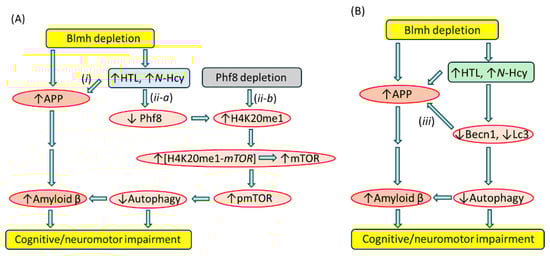 Although Blmh depletion downregulated Phf8 and upregulated APP and Aβ, Phf8 depletion upregulated Aβ but not APP. These findings suggest that three pathways contribute to Aβ upregulation in a Blmh-depleted mouse brain (Figure 6) []. In the first pathway (i, Figure 6A), Hcy metabolites upregulate APP (independently of Phf8), which leads to Aβ upregulation in Blmh-depleted or Hcy-thiolactone/N-Hcy-protein-treated mouse brain cells. In the second pathway (ii-a, Figure 6A), Hcy metabolites downregulate Phf8, which upregulates mTOR signaling and thereby reduces autophagy flux resulting in Aβ upregulation due to impaired clearance. The direct depletion of Phf8 by RNA interference, independently of Hcy metabolites, also starts a similar pathway mediated by mTOR (ii-b, Figure 6A) that results in Aβ accumulation due to impaired autophagy. These pathways remain to be verified in future studies by testing the effects of Phf8 overexpression or mTOR downregulation (by pharmacological inhibition using rapamycin or by RNA interference) on APP and Aβ accumulation in Blmh-depleted cells.