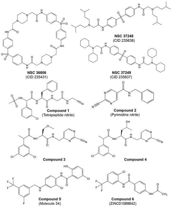 As mentioned before, AdVs encode a cysteine endopeptidase, which is also called adenain and plays a crucial role in the viral lifecycle. This protease is essential for virion maturation and infectivity [93]. AVP is activated by two cofactors, namely pVIc [94] and viral DNA [95]. This activation is crucial for producing infectious viruses, making AVP a key target for antiviral therapy. McGrath et al. [96] determined the crystal structure of the AVP–pVIc complex at a resolution of 1.6 Å (PDB ID: 1NLN), which aids in the design of effective enzyme inhibitors. Although no specific anti-adenoviral drugs are currently approved, several studies reported potential inhibitors (reviewed in [97]). A brief discussion about the current status of adenain inhibitors is provided below, and examples of these inhibitors are presented in Figure 3.