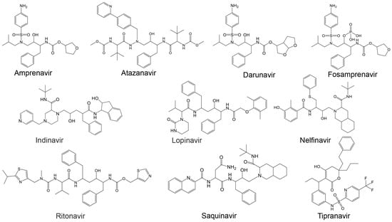 Additionally, Cardoso and Mendanha [155] investigated ten approved HIV protease inhibitors [164], including amprenavir, atazanavir, darunavir, fosamprenavir, indinavir, lopinavir, nelfinavir, ritonavir, saquinavir, and tipranavir, as repurposed drug candidates against SARS-CoV-2 (Table 3 and Figure 5). Despite molecular differences, all exhibited similar behavior in molecular dynamics simulations, highlighting their potential as therapeutic options against SARS-CoV-2 [155].