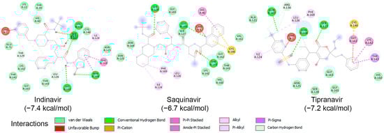 To examine the binding potential of the ten HIV protease inhibitors on HRV–3Cpro, a blind docking was performed on the entire surface of the protein using PyRx v1.1 (AutoDock Vina), with a box center at (294, 0.645, 0.237) and size (40, 40, 40). Interestingly, all ten compounds were placed in the catalytic site of the protein. Among the ten inhibitors, three exhibited binding affinities lower than −6.5 kcal/mol for HRV–3Cpro: Indinavir (−7.4 kcal/mol), Saquinavir (−6.7 kcal/mol), and Tipranavir (−7.2 kcal/mol). The interactions of these three compounds with the amino acids of the active site of HRV–3Cpro are illustrated in Figure 6. These three compounds fit perfectly into the active site of the enzyme and interact with the amino acids of the catalytic site, including those of the catalytic triad, primarily through van der Waals forces, hydrogen bonding, and Pi-cation interactions.