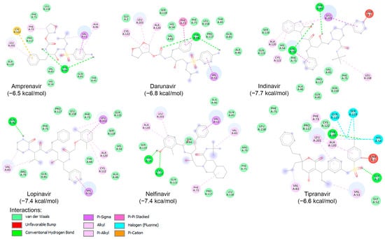 Molecular interactions of AVP with six known HIV protease inhibitors: Amprenavir, Darunavir, Indinavir, Lopinavir, Nelfinavir, and Tipranavir, displayed as 2D images. The binding energy (in kcal/mol) for each inhibitor is indicated below their respective interaction diagrams. The different types of interactions are shown at the bottom of this Figure. The amino acid residues of the adenovirus protease involved in the interactions are labeled and highlighted in colored circles. These circles correspond to different interactions indicated at the bottom of this Figure. The 3D structure of AVP was obtained from the protein data bank (PDB: 4 pie). Docking studies were carried out using PyRx v1.1 (AutoDock Vina).