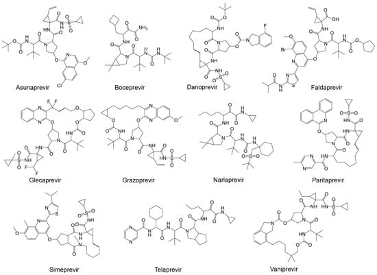 The importance and potential efficacy of non-structural NS3/4A protease inhibitors of HCV against SARS-CoV-2 have garnered significant attention in the scientific community. It has been suggested that these inhibitors are effective against SARS-CoV-2 [169]. Among the promising candidates are α-ketoamide-containing covalent inhibitors, which are particularly effective at binding to cysteine proteases like Mpro [63]. The presence of two adjacent C=O groups creates a powerful electrophile, enhancing their inhibitory action. Boceprevir was one of the first HCV antiviral agents to demonstrate inhibitory activity against both Mpro and coronaviruses [170,171,172]. Given the structural similarities between the HCV NS3/4A protease and SARS-CoV-2 Mpro, several studies suggest that a range of NS3/4A inhibitors could be effective against the SARS-CoV-2 main protease [154]. The HCV NS3/4A protease inhibitors that have been considered include FDA-approved drugs such as boceprevir, telaprevir, ritonavir, asunaprevir, paritaprevir, grazoprevir, and glecaprevir (Table 4 and Figure 8) [173].