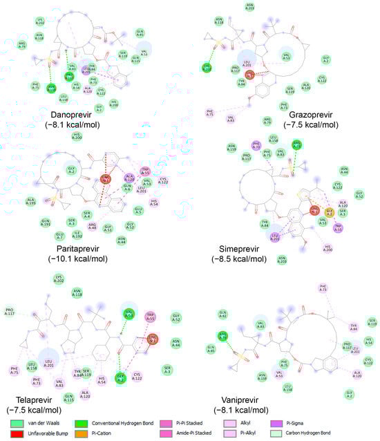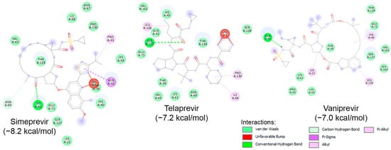 Similar to known HIV protease inhibitors, the inhibitory effects of HCV NS3/NS4A protease inhibitors on both HRV–3Cpro and AVP have not been extensively studied. To address this gap, docking studies of the 11 known HCV NS3/NS4A protease inhibitors on HRV–3Cpro were initially performed. As described previously, a blind docking on the entire surface of the protein using AutoDock Vina, with box center at (294, 0.645, 0.237) and a size of (40, 40, 40), was conducted. Notably, only 3 out of the 11 compounds—Simeprevir, Telaprevir, and Vaniprevir—were positioned close to the catalytic site. Subsequently, these three compounds were redocked with a box center at (296, −8.58, 4.8) and a size of (20, 20, 20). The binding affinities of these compounds are presented in Table 4, with Simeprevir exhibiting the lowest binding affinity (−8.2 kcal/mol). The interactions of these compounds with the catalytic site of HRV–3Cpro are illustrated as 2D images in Figure 9. As shown, the three compounds could interact with the amino acids of the catalytic triad, particularly with His40 and Glu71, through electrostatic (van der Waals) interactions. Nevertheless, further in silico and in vitro experiments are required to verify the inhibitory potential against HRV–3Cpro.