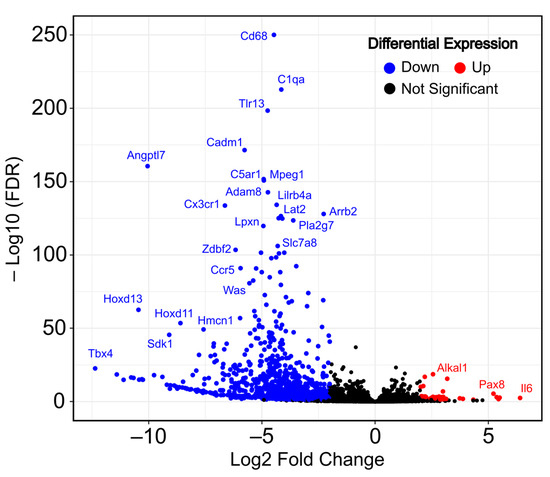 After the immortalization process, we identified a total of 1096 differentially expressed genes when applying standard thresholds of a |Log2FC| ≥ 1 and an adjusted p-value (FDR) < 0.01. As shown in the volcano plot (Figure 1), the transcriptomic changes show a pattern of a higher number of differentially downregulated genes than upregulated genes in immortalized MEFs. Specifically, we identified 1001 downregulated genes (shown in blue), with genes such as Cd68, C1qa and Tlr13 as the most significant, versus 95 upregulated genes (shown in red), including Alklal1, Pax8 and Il6. A complete list of all total up- and downregulated genes can be found in Supplementary Table S1.