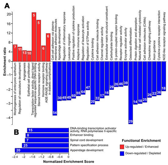 Biological processes enriched among the upregulated genes include events related to angiogenesis and vasculature development (Figure 3A), highlighted by genes such as Pax8, Aldh1a1 and Grem1. The regulation of epithelial cell proliferation is also an upregulated biological process, including Mapk11, Dusp10, Il6 and Vegfa genes. At the same time, the upregulated genes also show enrichment of several molecular functions: (a) transcription factor activity, where some of the genes include members of nuclear receptor families such as Nr2f1, Nr4a1 and Ar, and (b) hormone receptor activity with genes such as Vdr, Nrip1 and Gnao1.