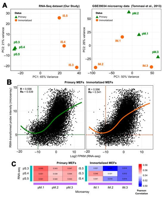 Comparison of normalized levels of gene expression during immortalization of mouse embryonic fibroblasts (MEFs) (immortalized vs. primary) between our RNA-seq and Tommasi et al. [43] microarray data. (A) The left panel shows the principal component analysis (PCA) of our RNA-seq data based on log2 transformation of gene expression counts derived from DESeq2 (three biological samples per state) and the right panel shows PCA of GSE39034 microarray data normalized by RMA. Green triangles indicate primary MEF samples and orange dots indicate immortalized MEF samples. Samples with the same end number follow the same embryo before and after immortalization (i.e.,—pS.3 and iS.3). (B) Correlation between the RMA-transformed microarray probe intensities and the log2-transformed RNA-seq FPKMs. Each dot represents the average values for each gene from all the biological replicates. Pearson’s correlation coefficient (R) is indicated for each comparison: the left panel shows a correlation for primary MEFs (green), and the right panel shows a correlation for immortalized MEFs (orange). (C) Sample-to-sample correlation comparison between our immortalization (RNA-seq) and Tommasi et al. [43] (microarray). The R values are plotted as a heatmap, where blue color represents lower R values, while red represents the higher R values. The left panel shows the correlation for primary MEFs, and the right panel shows the correlation for immortalized MEFs.