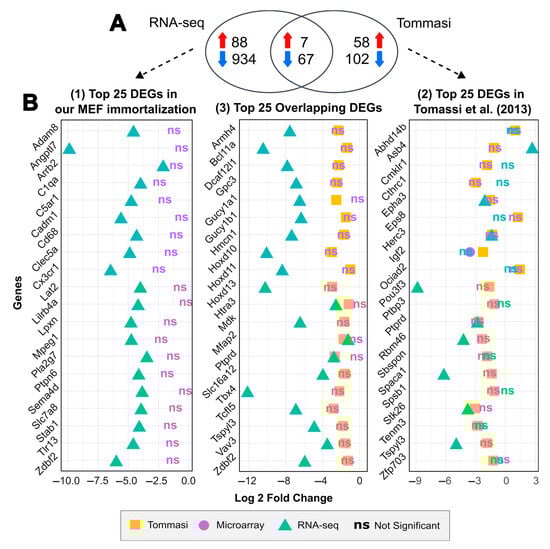 Comparison of the differentially expressed genes between different MEF spontaneous immortalization studies. (A) Venn diagram of 74 overlapping DEGs between our immortalization and reported by Tommasi et al. [43]. (B) Comparative analysis of the statistical significance of differential expression for the top 25 most differentially expressed genes found in our study (left panel), the top 25 most differentially expressed genes reported by Tommasi et al. (right panel) and the top 25 most significant overlapping DEGs between both studies (middle panel) using three MEF spontaneous immortalization datasets. The comparison shows the following: 1. GSE39034 microarray data—results reported by Tommasi et al. (yellow square); 2. GSE39034 microarray data—reanalysis (purple dot); and 3. our RNA-seq data (blue triangle); ns represents genes not statistically significant (−1 > log 2-fold change < 1 or/and p-adjusted (FDR) > 0.05).
