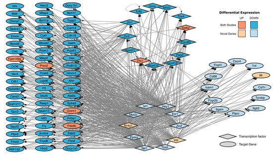 Finally, we integrated the common DEGs and our newly identified hub genes into a spontaneous immortalization-associated gene regulatory network. To accomplish this, we first identified the transcription factors (TFs) in the intersection of our DEGs with the lists of reported TFs [45,46], resulting in 82 TFs differentially expressed, 13 of which are found in both studies, namely Dlx1, Hoxd10, Hoxd11, Hoxd13, Peg3, Pou3f3, Satb2, Tcfl5, Tshz2, Uncx, Zic1 and Zic3. We then extracted the predicted TF-target gene interactions using the TFLink and TRRUST databases and constructed a gene regulatory network with the common DEGs, the novel hub genes and the top 10 TFs with the highest number of interactions. We identified Zic3, Hoxd11 and Zic1 as the top three common TFs with the highest number of predicted targets, and Spi1, Esr1 and Mef2c as the top three newly identified DE TFs with the highest number of predicted targets within the common DEGs and our newly identified hub genes (Figure 6).