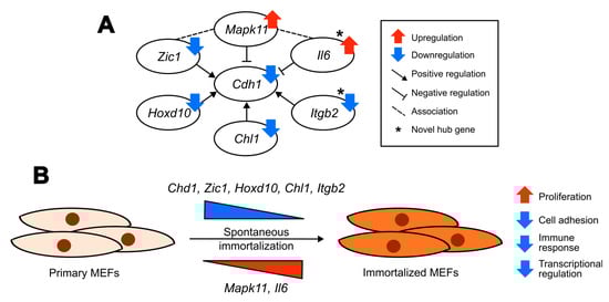 Transcriptomic profiling reveals a potential model for altered biological processes and predicted gene regulatory networks in MEFs after spontaneous immortalization. (A) Predicted regulatory network in MEFs after spontaneous immortalization. * indicates the novel hub genes. (B) Proposed model for altered biological processes, and the potential genes involved, in MEFs after spontaneous immortalization.