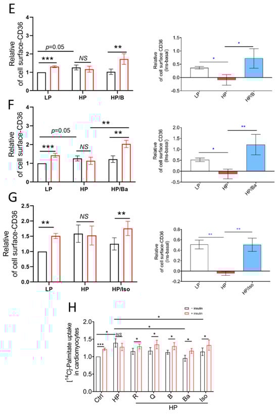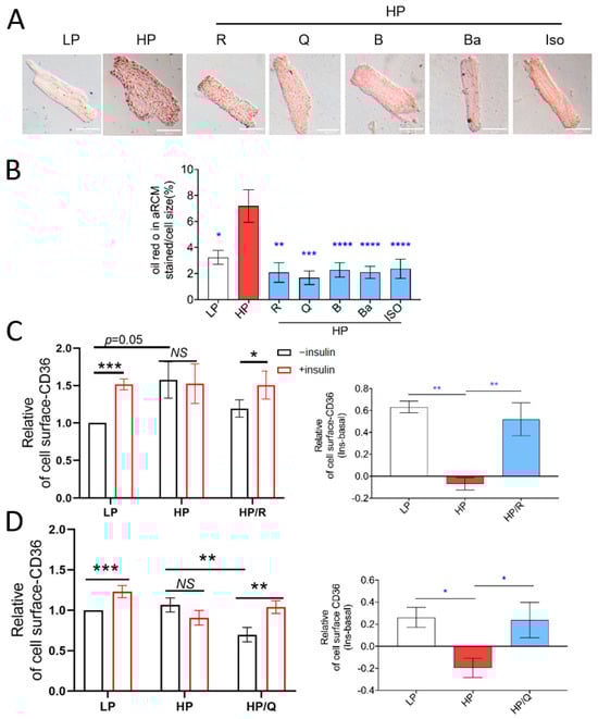 TCM compounds can prevent lipid accumulation and restore intracellular storage of CD36 transporter vesicles in lipid-overloaded adult rat cardiomyocytes. In panels (A–H), cells were incubated for 24 h under different conditions: low palmitate (LP, basal condition for aRCMs; palmitate/BSA ratio 0.3:1); high palmitate (HP, palmitate/BSA ratio 3:1); or HP supplemented with Resveratrol (R), Quercetin (Q), Berberine (B), Baicalein (Ba), or Isorhamnetin (Iso). (A,B): Lipid droplet content was assessed via Oil red O staining. Representative Oil red O images of aRCMs are displayed (scale bar = 30 μm) (A). Images were quantified using Image J-Win-64, (n = 5) (B). (C–G): Assessment of cell-surface CD36 in aRCMs. After 24 h, cells were short-term (30 min) incubated without/with 100 nM insulin. Then, cells were subjected to the biotinylation assay. CD36 was assessed using Western blotting in both biotin immunoprecipitations and total cell lysates, followed by quantification. In the left panel, basal and insulin-stimulated cell surface CD36 levels were measured, while the right panel shows the delta insulin effect on cell surface CD36, R (n = 4), Q (n = 5), B (n = 4), Ba (n = 5), and Iso (n = 4). Representative Western blots of biotinylated CD36 and total CD36 are displayed in Supplementary Figure S3A–E, left panel. (H) [14C] Palmitate uptake in HL-1 cells (n = 6). White columns represent basal condition, red columns represent HP condition, blue columns represent prevention of TCM compounds. In panels (C–G, left) and H, white columns represent basal condition, red represent insulin stimulation condition. Data are presented as mean ± SEM. One-way ANOVA followed by Duncan’s post hoc tests (among the groups, i.e., different culturing conditions) was used for the comparison. NS represents non significant, * p < 0.05 was considered statically significant. (* p < 0.05, ** p < 0.01, *** p < 0.001, **** p < 0.0001).