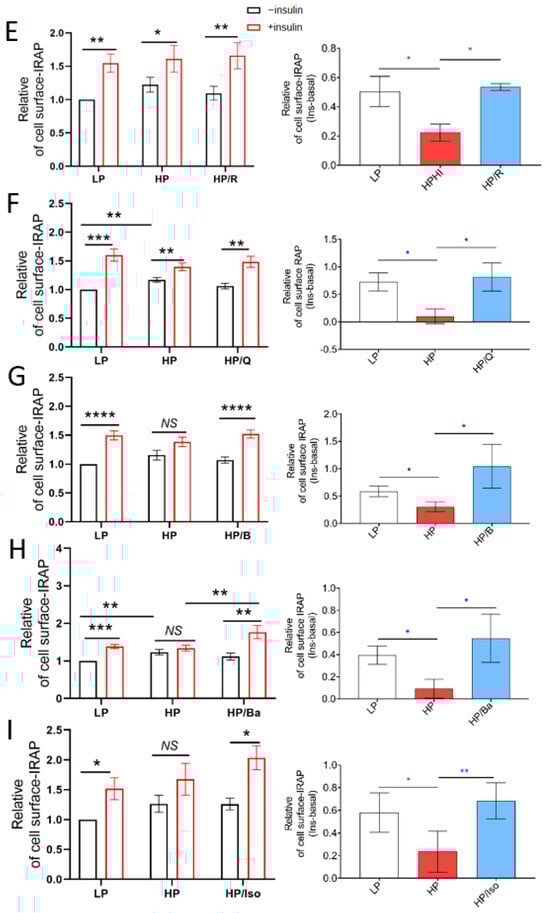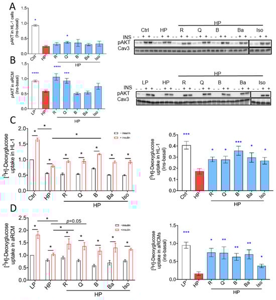 Inhibition of insulin-stimulated glucose uptake is another well-described maladaptive action of myocellular lipid overload and directly downstream of impairment of the classical insulin signaling pathway involving AKT phosphorylation. HP incubation indeed inhibited insulin-stimulated glucose uptake (Figure 2C,D; p < 0.05), whereas all five compounds significantly restored the insulin effect in both HL-1 and aRCM (Figure 2C,D; p < 0.05). As was done for CD36 translocation (Figure 1C–G), we also assessed insulin-stimulated GLUT4 cell surface abundance for all five compounds (Figure 2E–I). Accordingly, Resveratrol, Quercetin, Berberine, Baicalein, and Isorhamnetin also prevented the HP-induced loss of insulin-stimulated GLUT4 translocation.
