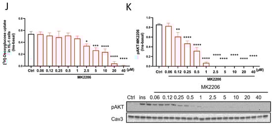 TCM compounds partially prevent decreased insulin signaling in lipid-overexposed cardiomyocytes but preserve insulin-stimulated glucose uptake in lipid-overexposed cardiomyocytes. In panels (A–K), cells were cultured for 24 h under various conditions, being ctrl (no palmitate; the basal condition for HL-1), HP medium (containing 500 μM palmitate and 100 nM insulin; HP condition for HL-1), low palmitate (LP, basal condition for aRCMs), high palmitate (HP, palmitate/BSA ratio 3:1), and HP supplemented with Resveratrol (R), Quercetin (Q), Berberine (B), Baicalein (Ba), or Isorhamnetin (Iso). After 24 h, cells were short-term (30 min) incubated without/with insulin (HL-1 cells: 200 nM insulin; aRCMs: 100 nM insulin). (A,B). Phosphorylation of AKT (p-AKT ser473) in HL-1 cells (n = 6) and aRCMs (n = 3) was detected by Western blotting. For quantitative comparison of p-AKT among the different conditions, these signals were normalized against the respective signal of caveolin-3 protein content (loading control). Representative Western blots of p-AKT and Cav-3 are displayed. (C,D). [3H] Deoxyglucose uptake in HL-1 cells (n = 6) and aRCMs (n = 6). (E–I). Assessment of the cell surface GLUT4 in aRCMs stimulated with LP medium, HP, or HP supplemented with R (E), Q (F), B (G), Ba (H), or Iso (I). In the left panel, basal and insulin-stimulated cell-surface GLUT4 levels were measured, while the right panel shows the delta insulin effect of cell-surface GLUT4, R (n = 4), Q (n = 5), B (n = 4), Ba (n = 5), and Iso (n = 4). Representative Western blot and quantification of insulin-regulated aminopeptidase (IRAP, which reflects GLUT4 translocation) are shown in biotin immunoprecipitation and total lysate fraction. (Supplementary Figure S3A–E, right panel). (J,K). [3H] Deoxyglucose uptake and phosphorylation of AKT (p-AKT ser473) in HL-1 cells treated with MK2206. HL-1 cells were cultured for 24 h under various conditions, being ctrl, HP, and HP supplemented with various concentrations of the pan-AKT inhibitor MK2206 (HP/MK2206) (J). [3H] Deoxyglucose uptake in HL-1 cells treated with MK2206. After 24 h, cells were short-term (30 min) incubated without/with insulin (HL-1 cells: 200 nM insulin). Then, cells were subjected to [3H] Deoxyglucose uptake assay (n = 4). (K). Phosphorylation of AKT (p-AKT ser473) in HL-1 cells treated with MK2206 was detected by Western blotting (n = 4). White columns represent basal condition, red columns represent HP condition, blue columns represent prevention of TCM compounds. In panels (C–I, left), white columns represent basal condition, red represent insulin stimulation condition. (J,K), white columns represent basal condition, red columns represent MK2206 inhibition condition. Bar values are means ± SEM. One-way ANOVA followed by Duncan’s post hoc tests (among the groups, i.e., different culturing conditions), or paired Student’s t-test (within groups, i.e., when analyzing short-term insulin effect) was used for the comparison (the comparisons were indicated either by a line or compared to Ctrl (J,K)). NS represents non significant, * p < 0.05 was considered statically significant. (* p < 0.05, ** p < 0.01, *** p < 0.001, **** p < 0.0001).